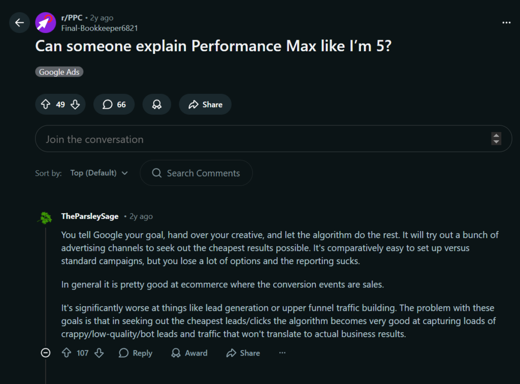 In reality, for everything except high-volume consumer ecommerce, Performance Max performs significantly worse than manual campaigns. And combined with the pitfalls of smart bidding I mentioned earlier, no lead-generation business should be using Performance Max in 2026.