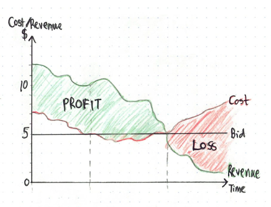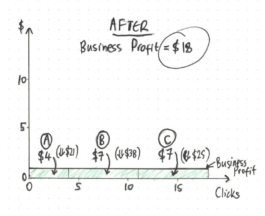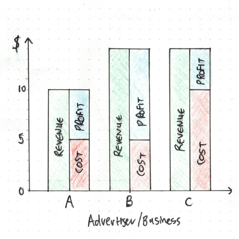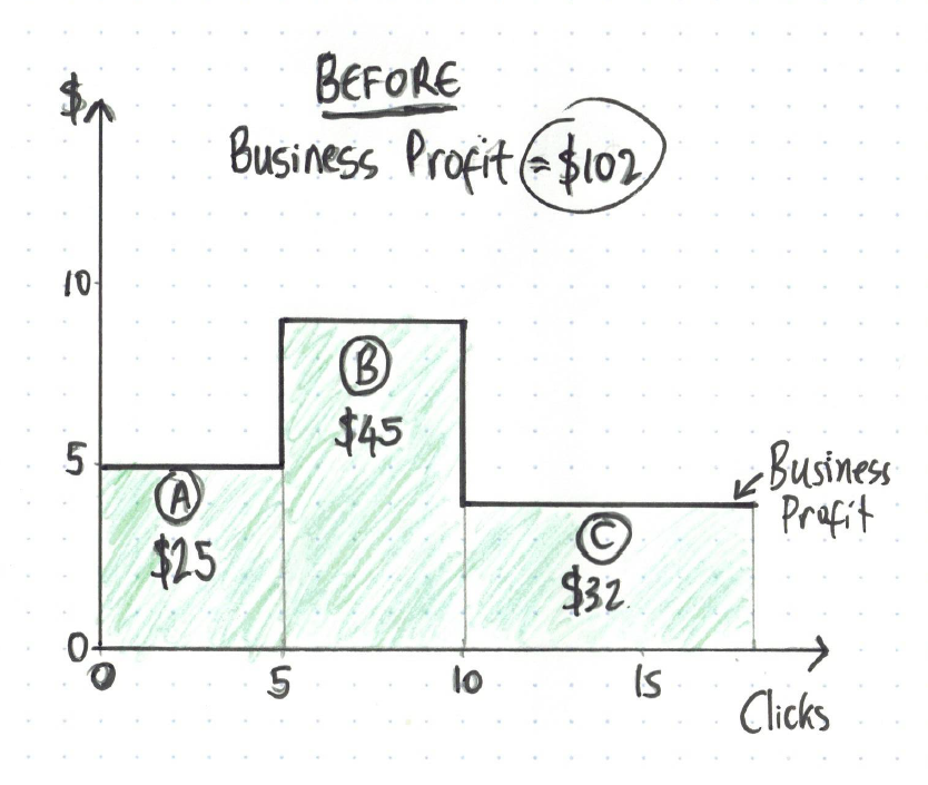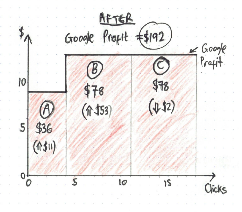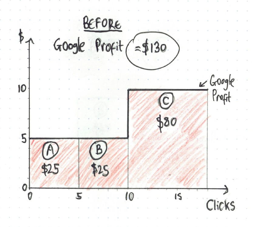 In the graph above, advertiser A and B both get 5 clicks, while advertiser C gets 8 clicks. Multiply this by each advertiser’s profit margin (from the first graph), and the combined profit for the 3 businesses is $102, and multiply click volume by click costs, and Google’s profit is $130 (see below):