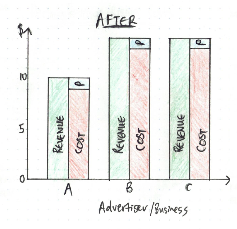 What is interesting here is that total combined market profit (i.e. Google profit + advertisers’ profit) has fallen 10% from $232 to $210, so from a marginal utility perspective, smart bidding has actually reduced overall economic value.