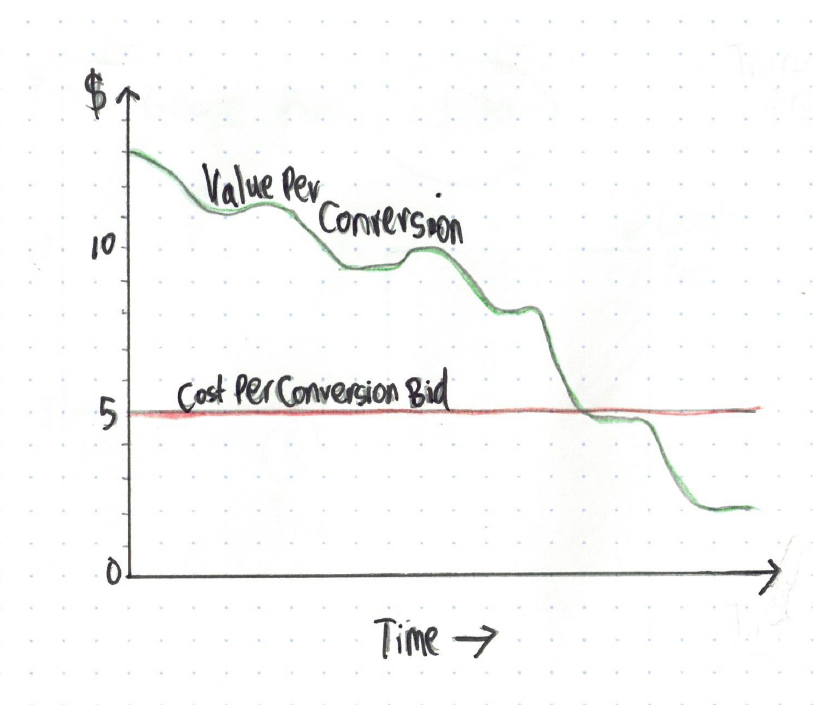What does Google do with this insight? Well, knowing that you’re probably monitoring the impact of this change very closely, deliver a temporary higher volume of high-quality traffic to your business to deliver at least a proportionate increase in customers. This will cause you to logically conclude that the change was beneficial, and cause you to drop your guard as a result. Then, after a certain period of time, Google starts delivering progressively lower-quality traffic until you notice and make changes, then backtracks slightly to maintain you as advertiser while extracting maximum profit.